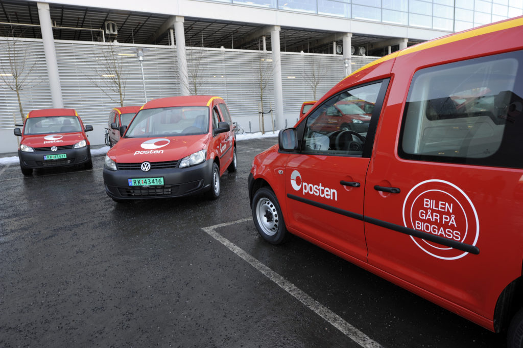 Posten har kjøpt 31 biler fra VW – VW Caddy, som alle går på biogass. FOTO: Posten Norge